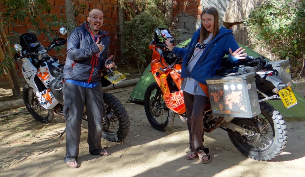 Last night as we were Skyping family a low rumble had us turning around to look out of Dave’s windscreen. It announced the arrival of a couple of bikers, as we’re the only ones on the campsite we were very pleased to see some other people. As they pulled forward we were overjoyed to see the big yellow square of British number plates. Always keen for a nose around a motorbike Jay popped round to say hello and to offer a drink. A short while later Dave was bursting with the sound of laughter as Clare and Sam told us of their adventures. They’re biking around the world, as well as top to bottom of it, and they’ve only just set off – it looks like it’s going to be one helluvan adventure!