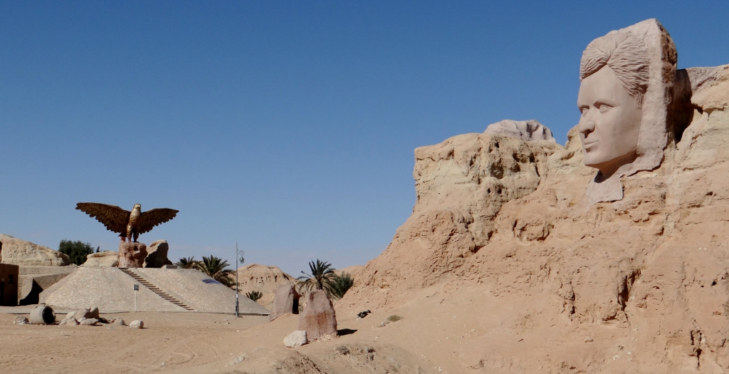 A brick arch announced that we had arrived at Tozeur Park (there are brick arches for everything around here), walking under it we’re greeted by a couple of men with camels. They continue to lie in the sun and shout over asking if we want a ride, there’s no hard sell, it’s nice. Tozeur Park appears to be some sort of a folly, designed to get the tourists with huge models of musical instruments, a childrens play area, a large statue of an eagle, bizarre human faces badly stuck onto a large lump of rock which has steps up it to the Belverdere (viewpoint) on the top. To cap it all the whole thing is surrounded on three sides by a golf course, battling to stay green in this desert land.