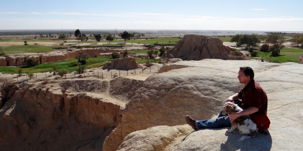 We had the place to ourselves, so Charlie got in some rock chasing while we looked around the random exhibits. Climbing the steps we looked out across Tozeur to the red mountains of the gorge we visited yesterday. To our left shining white tourist hotels popped up above the palm tree tops and around the rest of the view the oasis of palm trees abruptly stopped, halted by the vast desert and shimmering salt flats in the distance. We sat for a while and looked over the scenes playing out below us; a red tractor and a few figures wandering around one of the golf course bunkers, a man riding a donkey across a dirt plain, a blue tourist bus filling with passengers and leaving one of the hotels.