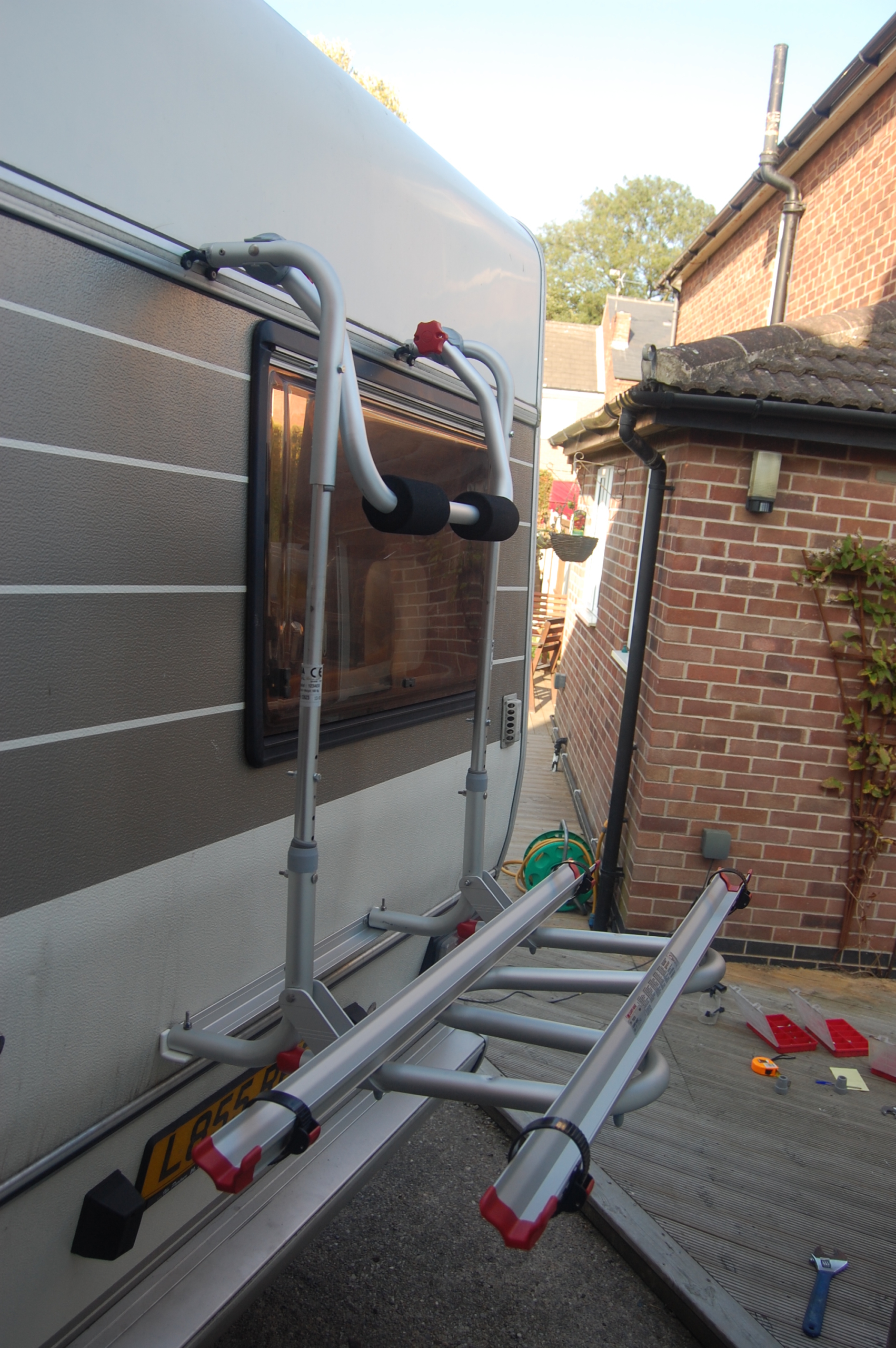 After a bit of meditation (staring at the rack hoping for inspiration) it hit me. I needed to engineer some sort of telescopic aluminium tubing so I could avoid the window. Quick search on t’Interweb revealed a few places you could buy the tubing from but something stopped me buying it; perhaps the Scottish blood in Ju’s side of the family (family moto: ‘every penny’s a prisoner!’). Popping my head in the half empty garage I spotted Ju’s old pair of crutches. Perfect. A bit of hack sawing, angle grinding and drilling later and the rack’s bolted into the van. This is my Dad’s influence rubbing off: after his long years working on farms and down the coal mines (I just spell checked this and at first this said cola mines; I was tempted to leave it :-)), he can make anything, with anything. Feels pretty sturdy, but we’ll see how it copes with some Romanian roads, or indeed the potholed tarmac which passes for UK roads at the moment. To top it off, Charlie’s chariot fits as well as our bikes.