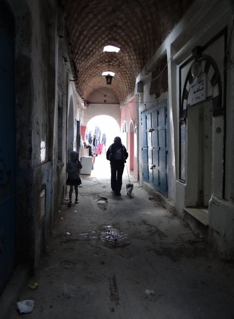 As we sat and looked in our guidebook we spotted one of the faux guides who tried to pick us up yesterday, he’d scored himself three French tourists, his persistence had finally paid off. Spotting them heading into the medina we followed, as we were here we might as well sightsee a bit, and the group of young lads fascinated by Charlie were now making moves to pull at his tail – time to go. Passing a dead rat as we entered I spent most of my time trying to keep Charlie from snuffling on the floor for fear of rat poison being down. It didn’t take long for us to get lost, wandering around looking at small shops, carpenters making goods and metal being hammered and melted into shapes. We were spat out on an unfamiliar street just as the rain started.