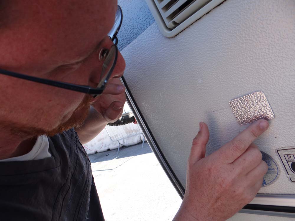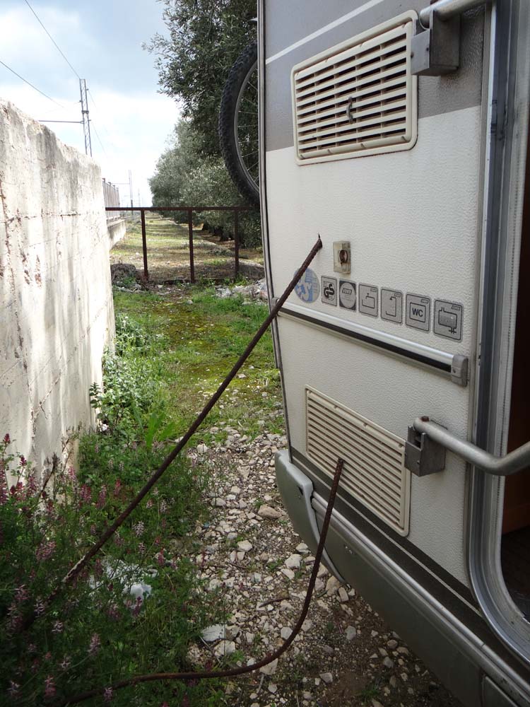 Two rods of ‘rebar’ (rusty metal bars) were sticking out from the concrete siding of the train track. They weren’t noticeable until they scraped along Dave and one of them decided to poke a hole in him. Poor Dave stood there skewered while poor Jay thought it was his fault; it wasn’t and I’m still in awe at how he copes with all the scary driving while I sit in the passenger seat and panic. We checked inside the fridge to see if we could see the rebar nestling among our Italian cheese collection as we couldn’t tell how far it had gone into Dave. Unable to see it in the fridge the only thing left to do was to un-skewer Dave, so Jay drove forward slowly as I pulled the bar towards me as much as possible. It worked and soon Dave (aka Scarface) was free, his skin punctured but it had gone no further than his insulation – phew!