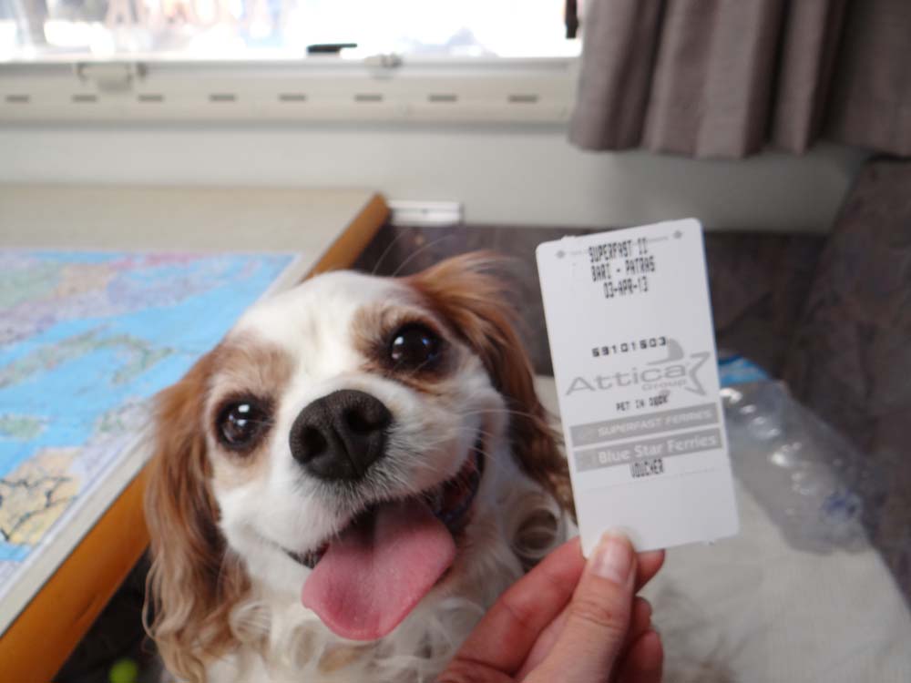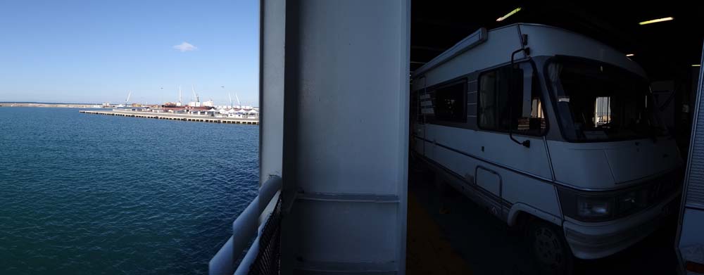 Rolling into place on the deck we’re behind an English family who it turns out are old hands at doing this, they split their time between the UK and Kefalonia – I’m every so slightly jealous. Electric hook-up drops down from the ceiling and everything goes on charge before we settle down to enjoy the view from Dave’s window. They’re still loading at the moment, and we aren’t set to sail until 8pm.