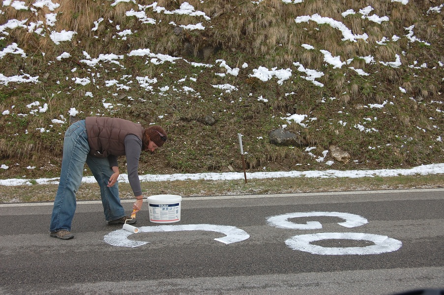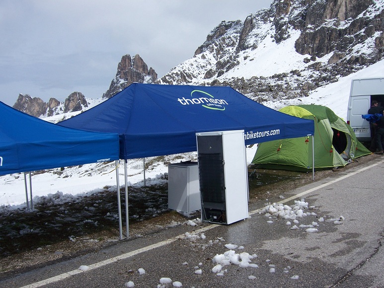 After a walk over the world’s ricketiest bridges and around the lake, our excitement couldn’t be contained. Stage 17 of the Giro d’Italia! We’d already driven the route up the mountain pass last night, albeit in ‘demo mode’ on our TomTom. Mucho twisty. The real thing turned up just as bendy, with the added bonus of some good old first gear steepness and snow, lots of snow. The valley’s rain had falled as the white stuff up here; my irrational fear of mixing Dave with frozen water kicked in. I reasoned that I’d been over the Pyrenees, Alps, Rif, High Atlas, Middle Atlas and Pico de Europa mountains; surely I can get over these here Dolomites?