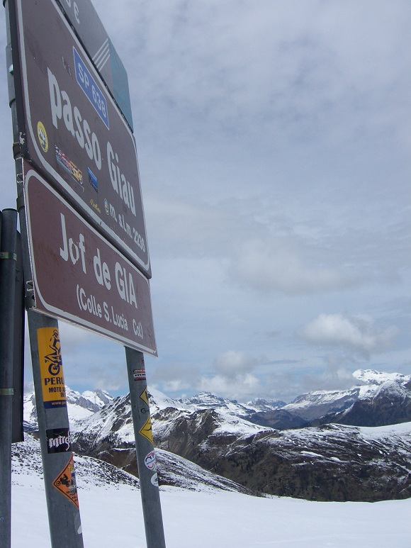 We indulged in an expresso and hot chocholate at the summit lodge, accompanied with a busload of French tourists, Italian camper vanners, German motorbikers (making me feel like a right idiot for being worried about the snow) and the odd Spaniard. The atmosphere was starting to build, and it’s only midday, the riders don’t get here until 4 or 5pm tomorrow. We’re glad we didn’t try and park up here, the whole area has been reserved.