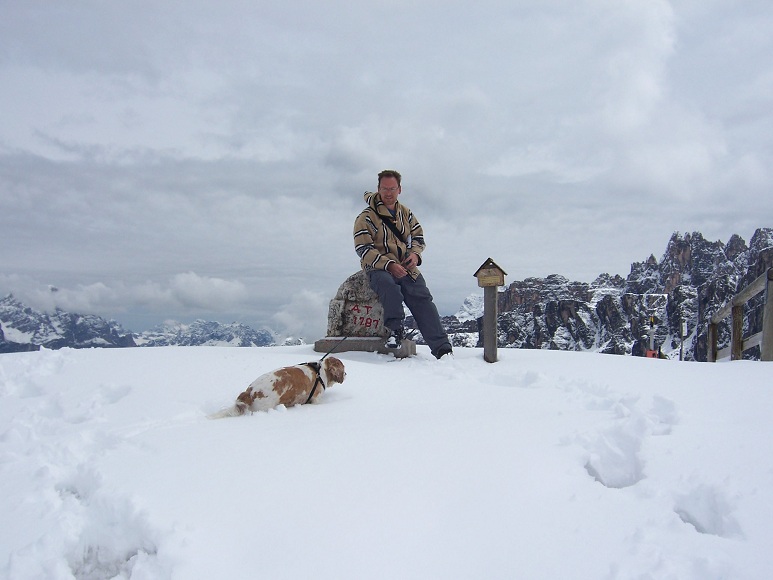 With Charlie harnessed up, we ascended the rest of the pass. Gravelled areas either side of the road are rapidly filling with campers, and the snow’s getting deeper. I’m off into it, running about like a kid with Charlie ploughing his face through it and rolling about. It’s nearly June, we didn’t expect this opportunity to fool about and make the most of it!