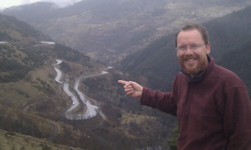 Anyway, just a few km after leaving Saillagouse, it starts to snow. Having just passed a ‘snow chains area’ sign, we have a little panic before reasoning to ourselves. It’s just sleet, there’s loads of rain, it’s too warm to settle and the like. We plough on (pardon the pun) and soon enough the road hits a 10 percent decline and we quickly lose sight of the snowline on the steep valley sides above us.