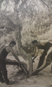 - Blokes cutting cork bark.