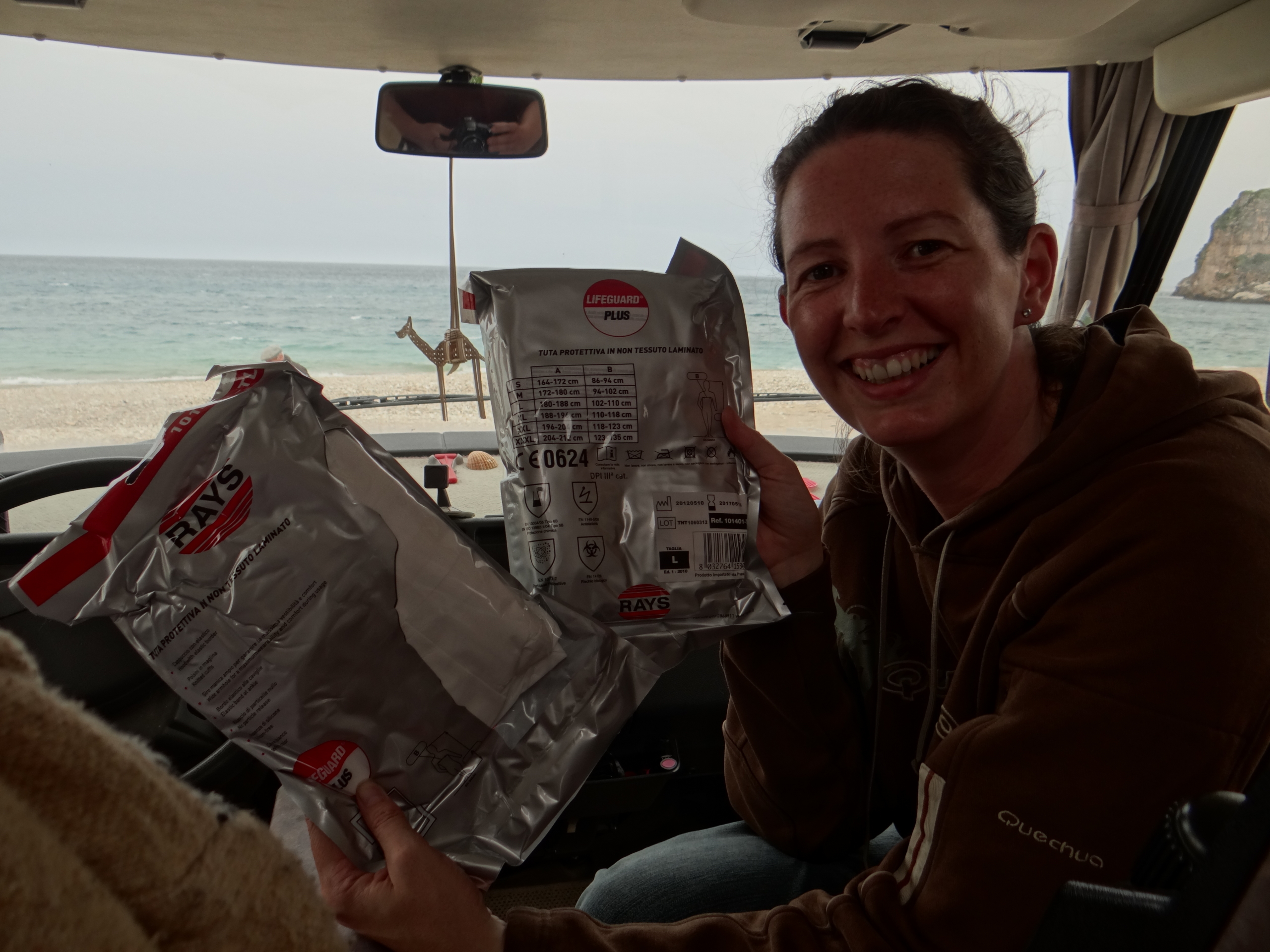 We’re now the proud owners of 2 Italian Coast Guard-issued safety suits, good for working in radioactive spills, if we translated them properly!