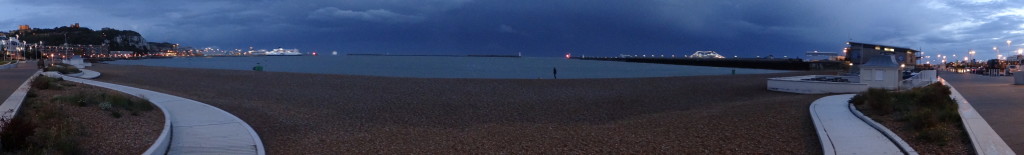 Dave the motorhome is excited. He’s been asking ‘are we nearly there yet’ all the way down to Stonehenge and across to Dover. Even the snarling traffic on the M25 and M20 didn’t phase him. He’s calmed down now we’re finally here, in a freebie (between 6pm and 9am) spot looking out over the pebble beach towards France, cloaked in darkness and spitting and spluttering lightning (N51.12121 E1.31365). It’s magical, we’re finally getting excited after a few days of gut-wrenching goodbyes.