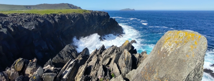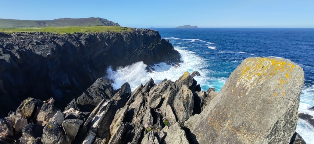 After a quiet night tucked up with several other vans at Clogher Strand (N52.156771, W10.459575) we woke to another sunny day, so followed a signposted 3km walk nearby. We set off along the road then turned into some fields which took us to a path along the rocky coastline.