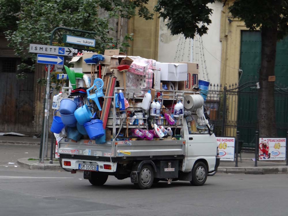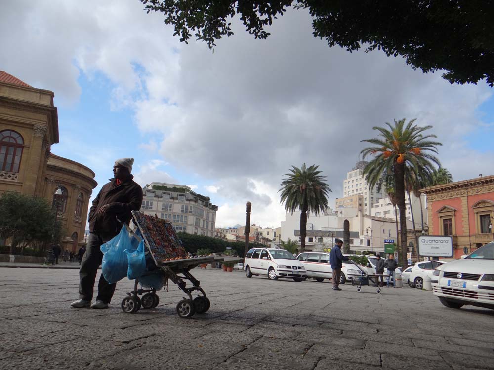 As well as the guy above trying to sell fridge magnets, we saw a few men today trying to eke out a living. On the way into town a man almost desperately tried to offload a pack of socks onto us, walking the street aimlessly with a bag of them. Outside the Cattedrale an elderly chap limped around passively proffering sun glasses; I watched him for ten minutes, he made no sales. Tiny Ape vans trundled about with a few crates of veg, enlarging themselves to giants with loud speakers mounted above the cab, the driver yelling out his prices. At one point we passed a sleeping tramp, his dog barking at us to stay away. Palermo’s skint.