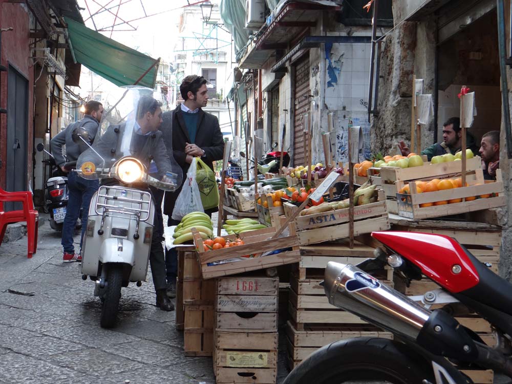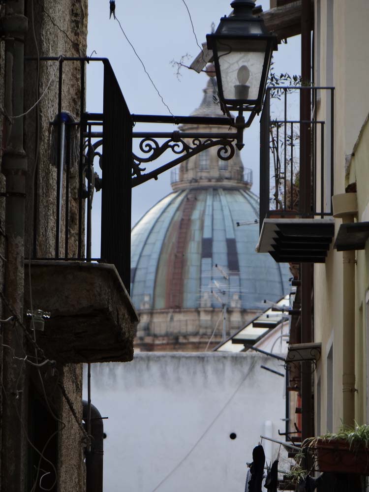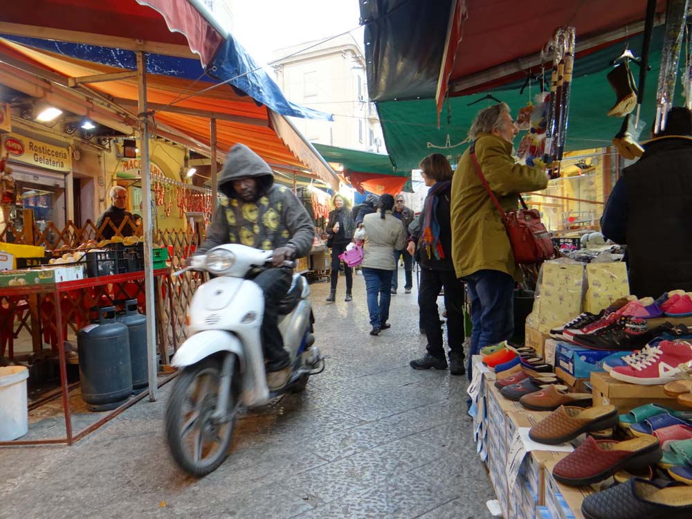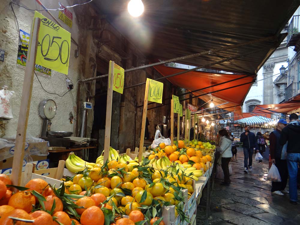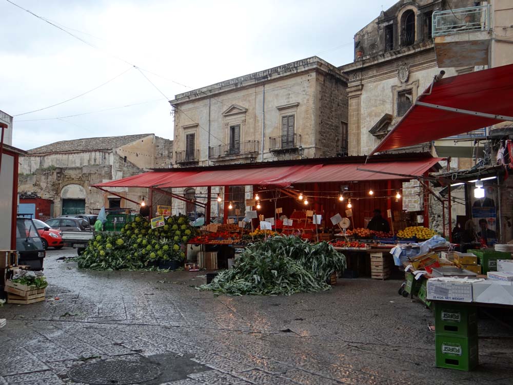 The photo above was taken in one of Palermo’s famous street markets. We got there on foot, walking a few km from here, taking the road towards the port, past the imposing stone prison, following the continual steady stream of traffic.