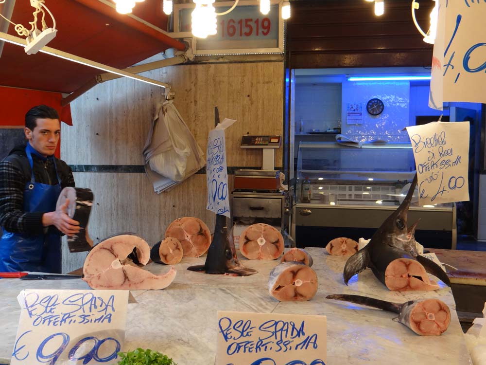 Heading for the Cattedrale, wondering why it’s not called the Duomo here, we stumbled upon one of Palermo’s back street markets, this one titled the Vucciria. The roads are narrow, in an organic medieval wind of arteries through the tall blocks of crumbling apartments, each with an array of iron-railed balconies.
