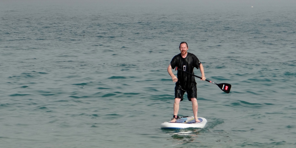 Spotting our aire neighbours on the beach with their paddle board, we walked over feeling the warm sand under our feet and chatted with Tony and Marion from Manchester. Tony let Jay have a go on his stand-up paddle board, uttering the now infamous words ‘it’s very stable, in fact they’re quite difficult to fall off’ – how Jay managed to prove him wrong!