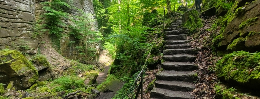 We really like this place, and would stay a few days, but a bank holiday commeth and so do the campers. Every pitch is booked tomorrow so we’re off to Germany in search of a stellplatz near to a Parkrun at the weekend. From our pitch (which admittedly was a tad awkward to get on and get level, much reversing and ramp climbing), we can easily walk to the old town or (via some serious steps) up into the forest. Up there in the greenery there’s a great view over the town, or you can head along the famous hiking route, the Wolfsschlucht, Gorges du Loup or in English, the Wolves’ Gorge.