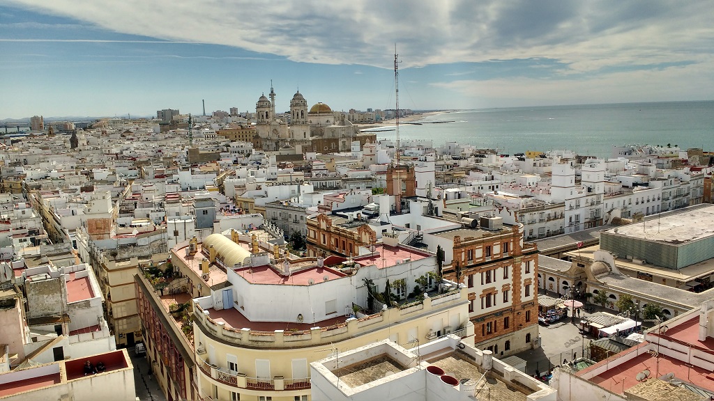 Like us, Steven and Linda had done no research either (endless years on the road seem to have this effect), other than to identify the fact there’s a camera obscura set atop one of the city’s many towers. Steven’s a photographer (one of his shots is sold world-wide at Ikea) and creates unique pin-hole photographs using digital equipment, so had an interest in seeing this larger version of a pin-hole camera on the Torre Tavira, the highest point in Cadiz old town. I fancied a look too, so Steven and I headed in while the ladies found a nearby eaterie. Through a wee ‘lost in translation’ moment we managed to buy tickets for the camera obscura which didn’t actually let you visit the camera obscura (whoops), but still got to enjoy the views from the top of the tower (the official website is here). From up there the city, built on a spit of sand which long since ran out of room to expand (Spanish law prevents it from reclaiming land from the sea), it’s a packed-in hubble bubble of mis-matched flat-roofs, reminding me of views over Fez in Morocco, with mosques swapped for churches. As Steven noted, it’s the kind of view you could stare at for hours, keeping spotting more and more details, each of us seeing our own version of the same image, depending on what’s happened in our past to draw our eye to them.
