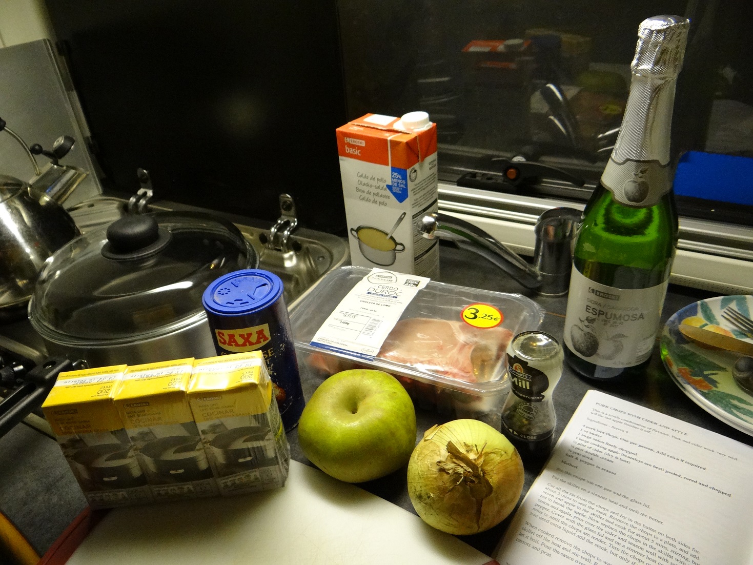 Last night, in an attempt to make up for inexplicably forgetting to pop Zagan’s handbrake on, I knocked up some grub with one of our skillets. Pork chops in a cider, apple and onion sauce, with peppered mashed spuds. Turned out nicely, phew. Given the flood of free time pouring over us, and the fact we now have the double skillet to use as an oven, I’m trying to build up my cooking skills a bit.