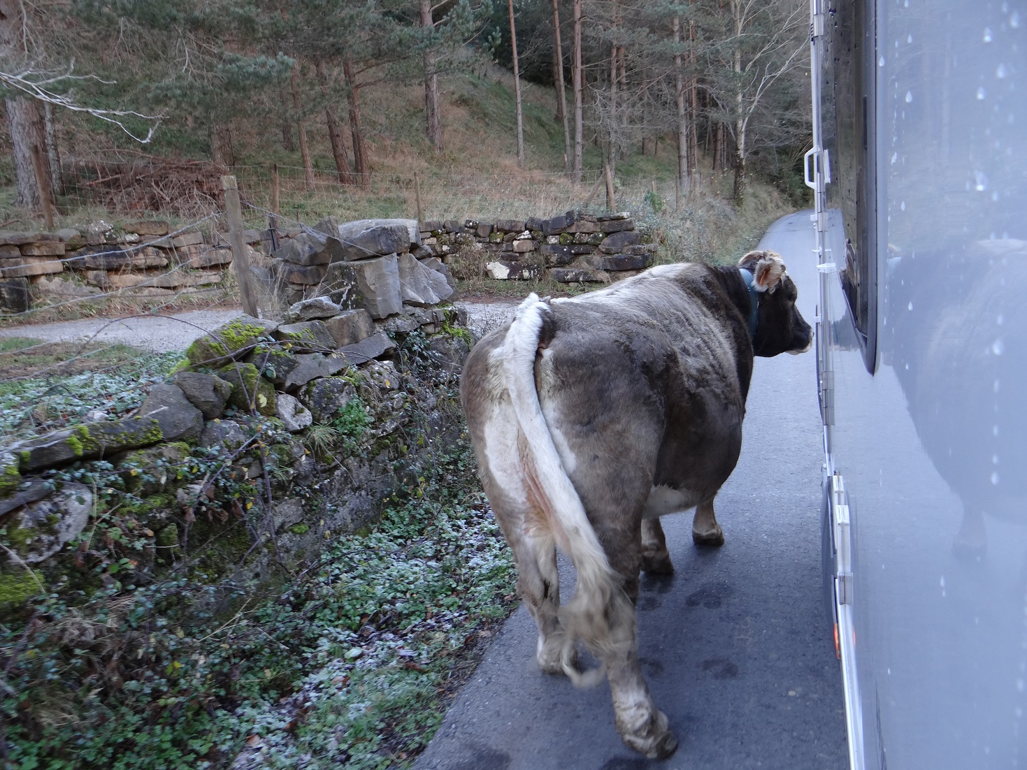 Our position in the valley below Ansó village meant we weren’t going to feel the sun for a while. The heating had been on low all night. We got up about 8 and cranked it up to 20 degrees. Ju sat in Zagan and crafted some stuff on the laptop. I stood outside breathing brand new air and warming my hands under the heater’s vent when, with a cough, it conked out. Neither of us can work it out. The gas had stopped flowing, both bottles were open, but the system’s auto change-over valve didn’t trip. Maybe the 11Kg bottle had gas left, but only butane which was refusing to come out of liquid form in the cold? Dunno. The heating started when I manually switched to the 6Kg bottle, and worked again from the main bottle later in the day. Happy days.