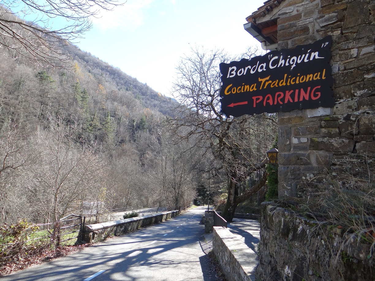 Casting about for something to do around Ansó, I came across an article in the Telegraph about a chap on a walking holiday, who’d raved about a traditional eatery up the road – the Borda Chiquin. Hmmm, up the road. That means north towards the mountains and France. Our map showed all the roads around Ansó as white, which is one up from a dirt track. In other words, white road = white knuckles when attempting to amateurishly manoeuvre a great big stupid-wide white box. Balls to it, grub sounded cracking, cheap, simple and authentic – all roasted lamb and wild boar sausage. Off we went.