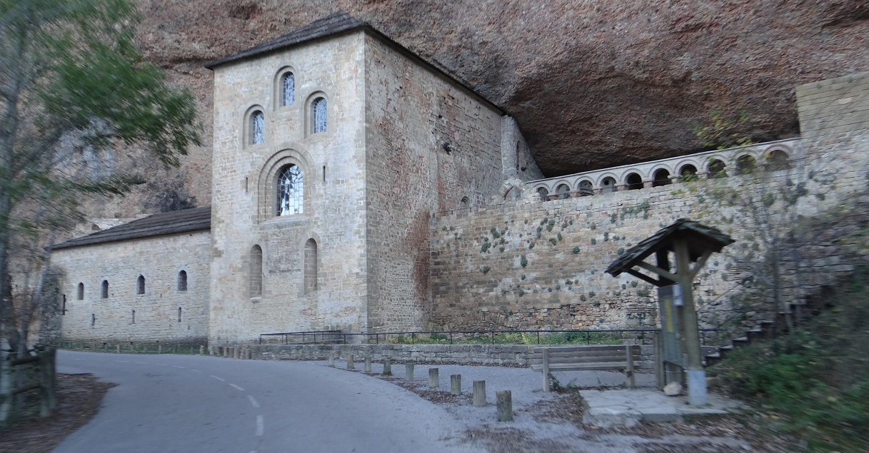 Zagan the motorhome has finally alighted in the pine-hidden coach parking at the Monastery of San Juan de la Peña (N42.50815 W0.66384) after today’s 2nd gear efforts on Pyrenean back roads. We’re alone here. Apart from the monks maybe, but they’re keeping themseves to themselves, behind the high walls of the nearby more modern part of the monastery. Scratch that, a German panel van’s just arrived, much to Ju’s relief (yeah, OK, I’m a bit relieved to have some company too – these woods are a bit scary).