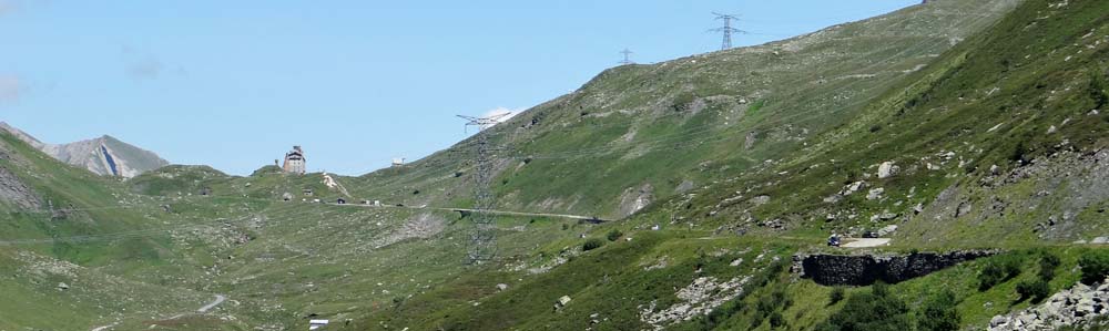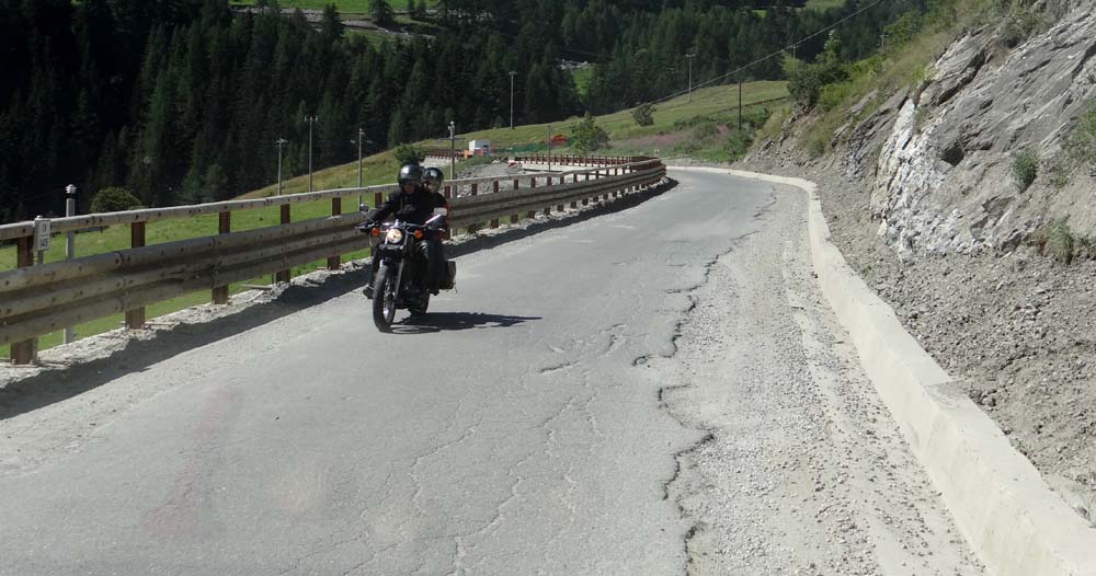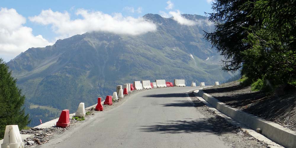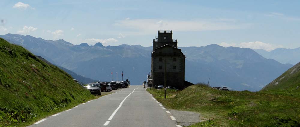 At Courmayeur we turned left and began our climb up to the Col du Petit St Bernard. It’s about 800m lower than the Grand Col, but the road is about twice as twisty and half as wide, as there were road works taking place all the way up it. Dave coughed his way up and round the steep hairpin bends which had taken a flashy BMW motorbike as a victim, a group were picking it up after it had stalled going around the apex – we saw it later and the damage seemed only to be to the rider’s ego.