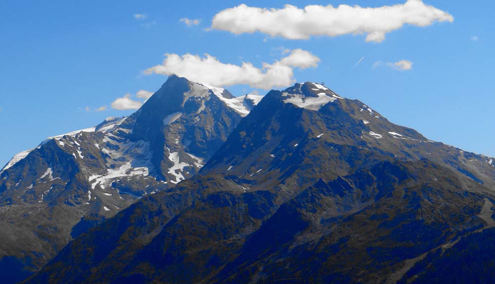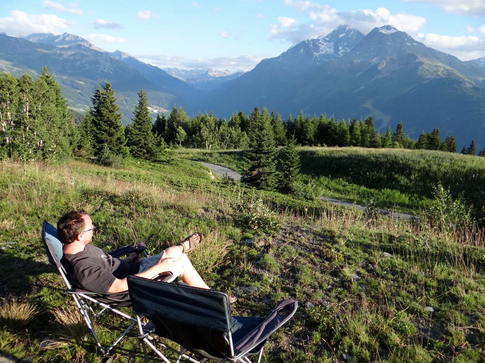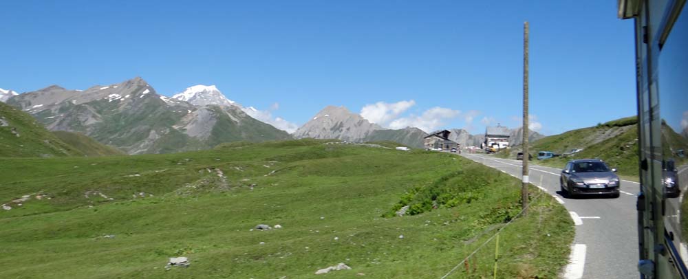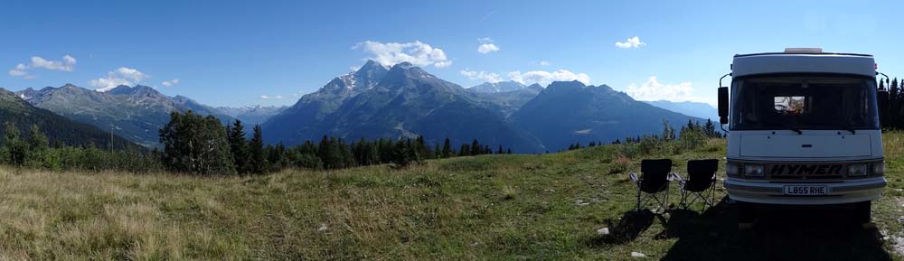 Dave the motorhome has the most amazing view from his window, and he deserves it after the day he has had. He’s parked up for the night in the temporary Aire in La Rosiere, France (the usual Aire is having some construction work done on it) which looks out over the Tarentaise Mountains and the ski resort of Les Arcs (N45.62927 E6.85603).