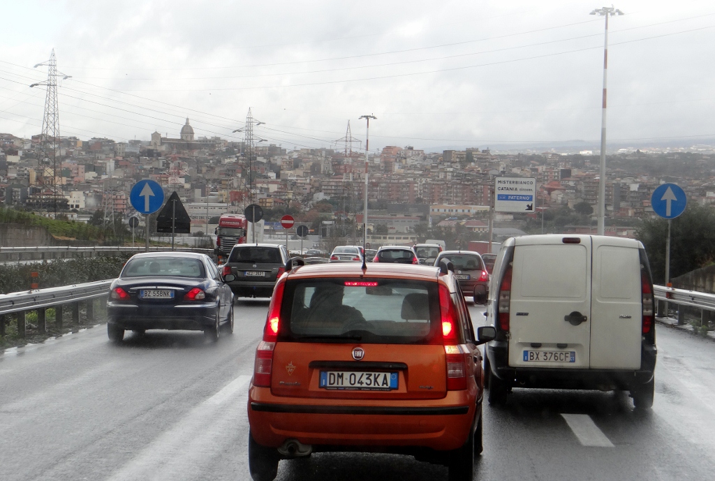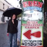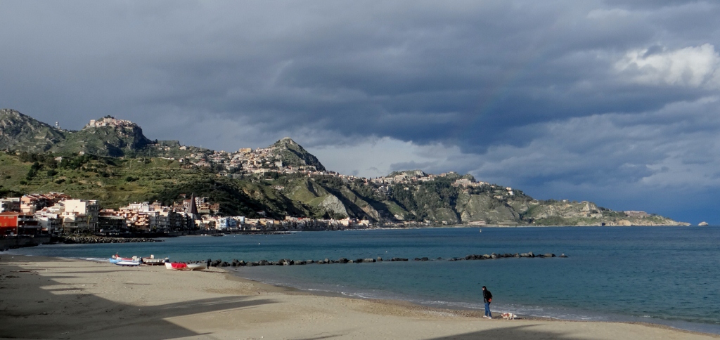 This morning it was still raining both outside and inside Dave – the rear skylight has sprung another leak. Our shoes sat underneath it and caught the majority of the water, so they are now drying instead of Dave’s floor. The rain turned to sleet and it was time to leave, we had thought about driving around the north side of Etna so we wouldn’t be retracing our steps, and to see if we could spy the new crater formed by the eruption earlier this year. But the low cloud would mean Etna would be invisible to us, so we opted for the free motorway instead to get us quickly to the coast. Once there it was only €1.70 in tolls to get up to Giardini Naxos and the safe haven of our €6 a night campsite.