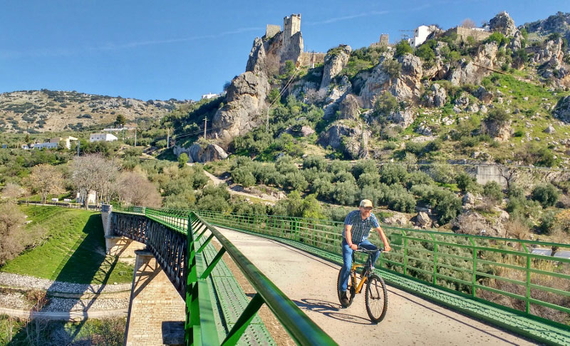 We parked up with a handful of other motorhomes and after a spot of lunch the bikes were off and we set off along the Via Verde de la Subbetica. The cycle path is 57 kilometres long and follows the route of the train which used to transport all of the olives from the region. It also joins up with another Via Verde near Jaen so you can follow 112 kilometres of the ‘oil train route’. This means you get to cycle over old level crossings, complete with little white buildings next to them now transformed crossing operators hut into art galleries or cycle hire places. Through tunnels, over viaducts and all amongst some amazing scenery.