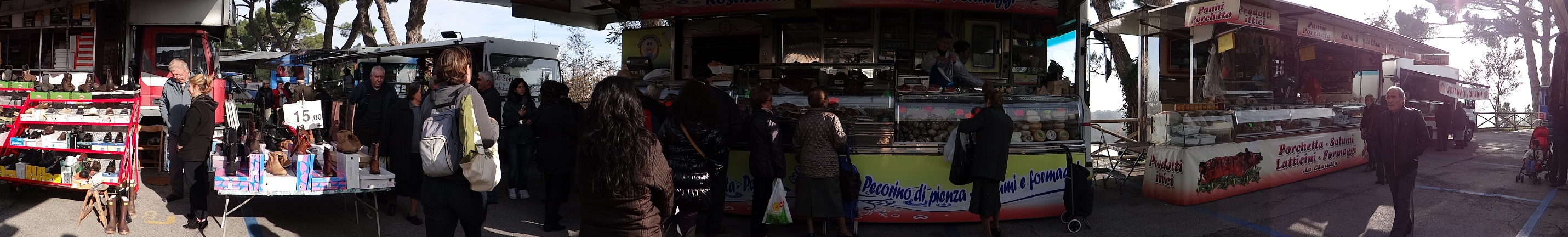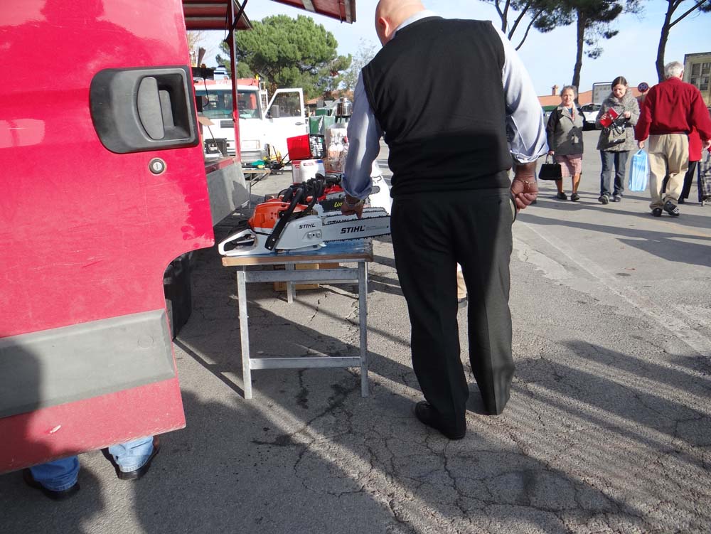 Back into the market, I’m permanently amazed by the Italian stalls. Like American RVs, they double or triple in size once they’ve parked up. Slides slide, metal doors open, flaps unveil ranks of batteries, A Dracula coffin on top of each cracks open at the press of a button and unveils a spreading awning like Batman’s wings. Within minutes, tired old vans stretch their chests and bang! A shop appears.