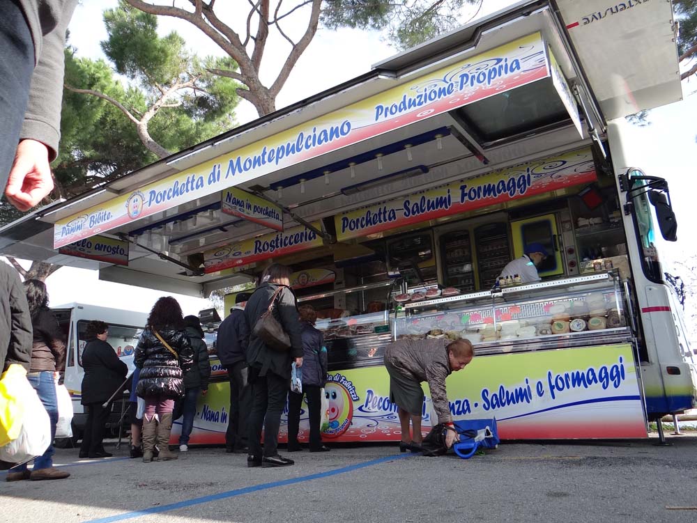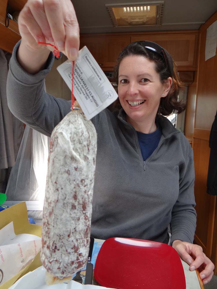 Wild boar salami tops the list among a veritable sea of tasty treats, mainly as we could tell what it was. ‘Ching-ya-lee’ pronounces the stall owner, jumping from the heights above to our level, and slowly pointing to each sausage we could see and then to a picture of a wild boar (Cinghiale) or a pig, depending on which type of animal had volunteered itself to be munched upon. Once she’s sussed we want the hairy tusked variety, she climbs back up and starts selecting a range of suitable sausages and laying them out before us, no rush, she sees we are obviously wild boar sausage connoisseurs no doubt? The same scene played out around us, a huddle of women at the cooked chicken stand had specimens held out on a long fork to inspect, many being rejected with the shop keeper showing no loss of patience. Charlie lost patience many times however, the smells were too much as he squeaked his way into knots at out feet. We ended up with an €8.50 sausage (which lasts until March 2013!), €4 worth of the most succulent cooked pork sliced with an intense salted stuffing, and a box of roast spuds and rosemary (which didn’t survive 20 minutes back in the van).