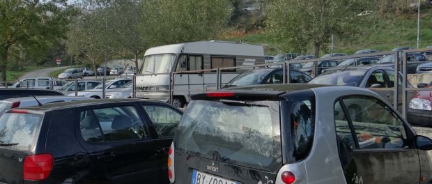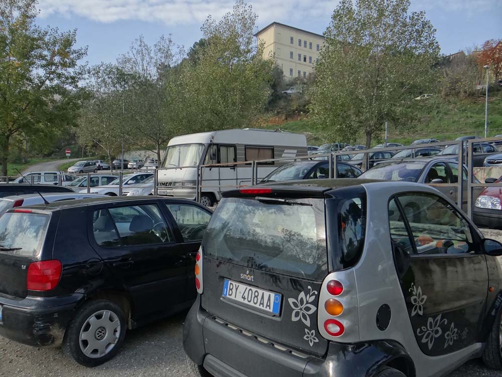 Dave the motorhome is contemplating life in a bobsleigh team, or maybe a bucking-bronco rider, after rolling his way into the Umbrian hill town of Ficulle via a crazy B road. We’re sat in a free sosta (N42.83047 E12.06858). Only a Polish chap in a self-made but Brit-registered (it’s his boss’) white windowless motorhome for company.