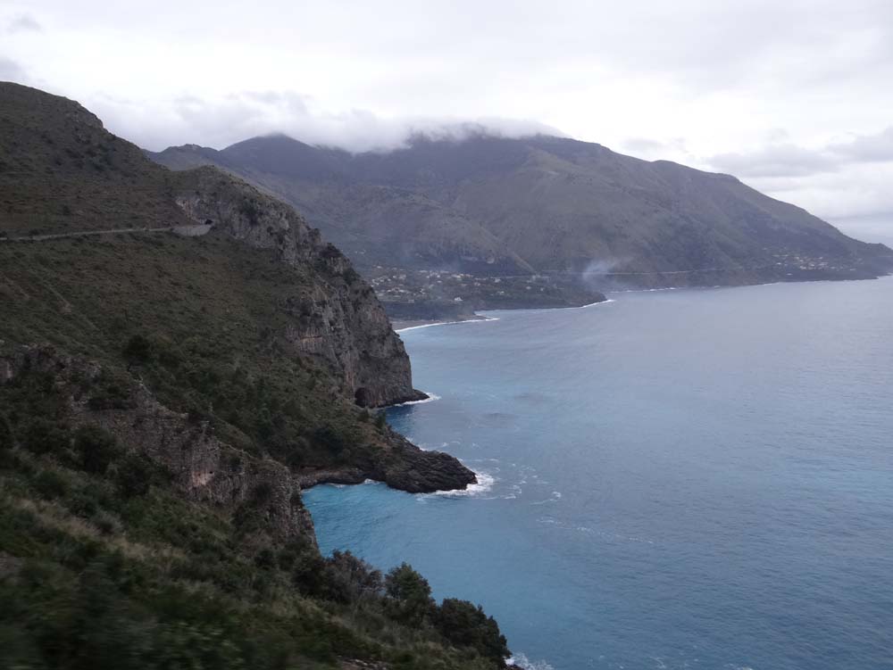 We’d set off late from Castellabate after I’d popped in a couple of hour’s work and Ju had done some research on filing company accounts (as you do) and walking Charlie on the beach, in the opposite direction to the washed-up dead cat. The map shows a yellow road running along the sea, with a green bar all the way along – a route with a view. It sounded like a corniche and I fancied some sea-mountain action, the opening song to Italian Job once again playing in my head.