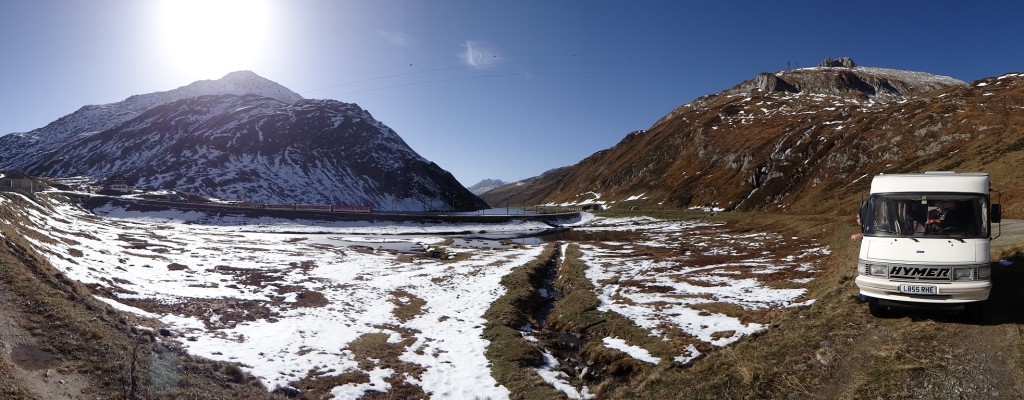 Dave the motorhome is resting (N46.66191 E8.67178) after a hard day’s climb, in an out-of-this world location on top of the Oberalppass, Switzerland. Yesterday’s car park set us back 18CHF (about £12), in a fairly dull location near an industrial estate. Today we’re staying for free, in a spot with the most incredible views.