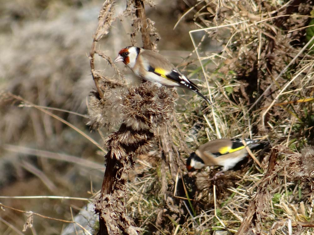 Your feathered friend is a Goldfinch, often seen in family groups of up to a dozen or so, they feed regularly in our garden especially winter time after their favourite food of thistle seeds have gone. They are very fond of Niger seed from our feeders.