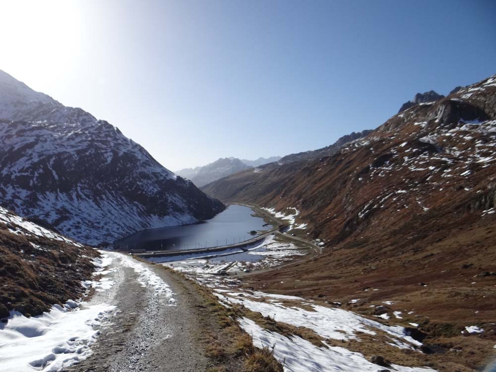 Just the other side of the pass, a few motorhomes are cheekily parked in paradise. They’re all Swiss, so we guess it must be OK to stay here – both from a legal point of view and the fact we might freeze or be snowed in. Nope, we’re not exactly mountain experts, they’re big fearful things to us. We joined them, went for a walk up a crazy 4 x 4 track behind us which somehow bypasses the pass road.