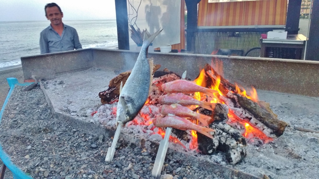 The restaurant we chose had a few people in it when we arrived, and being Spain more families arrived as we ate. By the time we left it was packed. We opted for a couple of starters; blood sausage with rice and deep fried aubergines and were already full after eating these. For main course Jay went for chicken while I plumped for red mullet which was cooked on a stick by a fire in a boat by the beach – it seems to be the done thing around here. I manned up and removed the heads myself (normally Jay’s job) and after a drawn out battle with a lot of fish bones, I was stuffed.