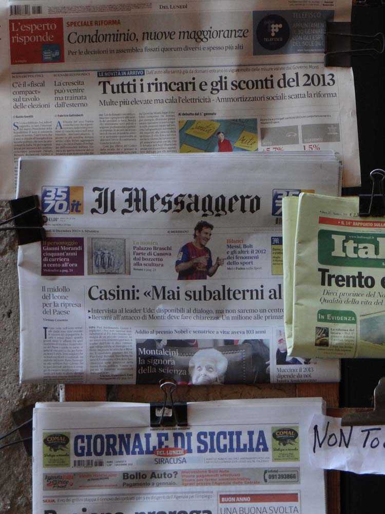 I’ve often wondered what is must be like for a non-Brit to walk into my local fish and chip shop and try to work out what’s going on. For one thing, ‘chips’ means ‘crisps’ in most parts of the world? We ask for a ‘bag’ of chips, but they’re wrapped in sheets of paper, not sold in a bag? The shop only sells two types of fish? And they’re in batter? And you can have a battered beefburger – seriously? Anyway, I have some idea now – the panini shop was as local as could be. We almost bought a horse-meat sandwich. Fortunately one of the staff who looked like an Italian-American in Saving Private Ryan spoke English and sorted us out with delicious chips (I had mine for breakfast) and a mozzarella and porchetta panini, with a tomato-slice-of-unknown-vegetable-sauce which he recommended, €6 the lot.