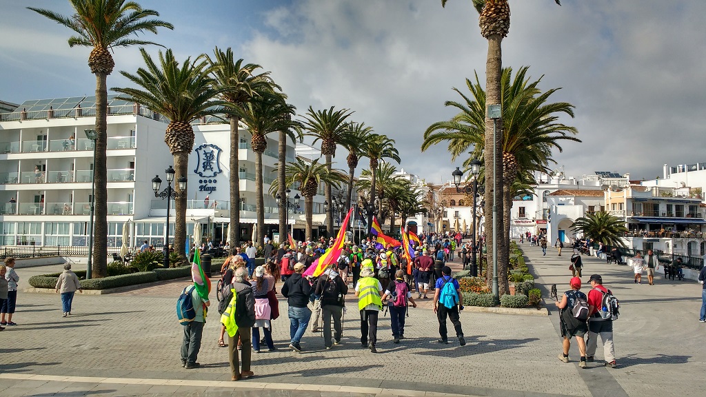 While Ju and I were wandering about one sunny morning around Nerja’s palm-lined meeting point, the Balcony of Europe, some kind of demonstration seemed to be taking place on the circular raised area facing the sea. A group of people dressed in walking gear were singing, standing behind a poster, maybe about 100 of them, with a few people stood in front listening and when the song had finished one of them spoke to the group in Spanish.