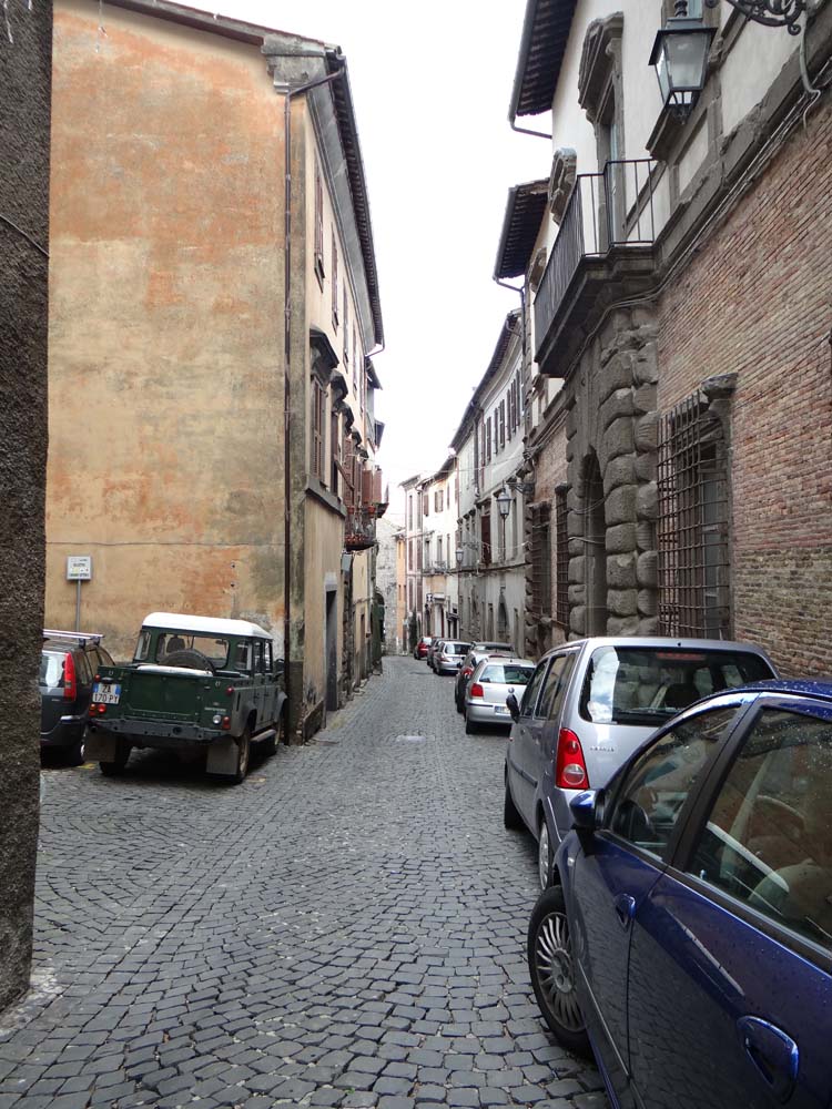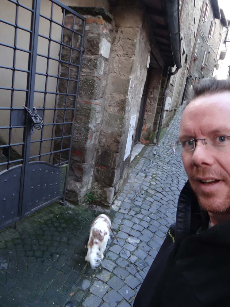 In a break from our old lifestyle, I did manage to get out for lunch, dragging a reluctant Charlie around the sodden streets of Montefiascone, getting lost and going around in circles. The town is much the same as the last time we were here, a pretty little core surrounded by concrete (earthquake-proof) low blocks of flats, houses and shops, which quickly dissipate into flowing countryside. Today’s grey though, and the views are muted. Tomorrow, with any luck, we’ll get back on the road, one day’s work is enough for me for now, slacker that I am!