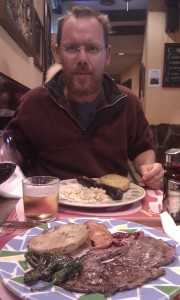 - White beans and sausage, a Catalan dish and far tastier than it looks. Ju had thin sliced steak and roasted peppers.
