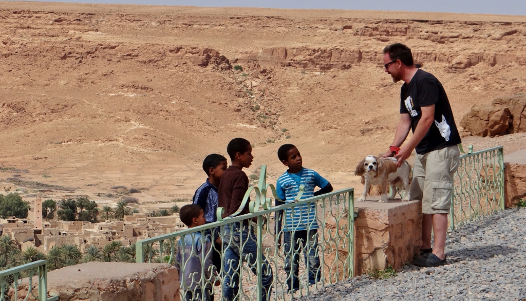 Jay explaining to the begging kids at a view point (each lay-by and viewpoint is manned by someone trying to sell you something) that they can stroke Charlie for free