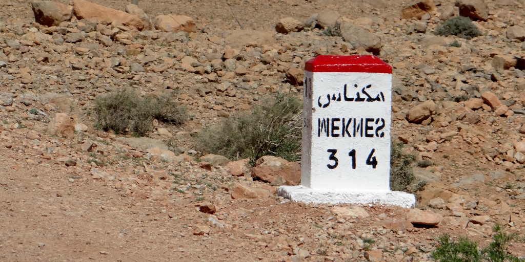 Someone had their stencil the wrong way round, for loads of these markers to MEKNES along the roadside
