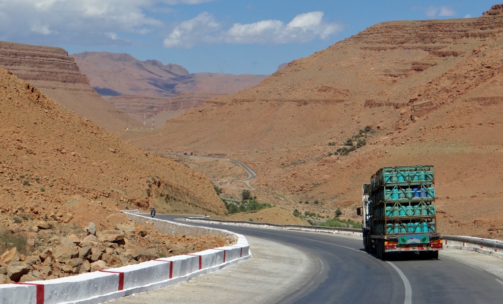 Wagons laden with hundreds of gas bottles crawl over the mountain passes