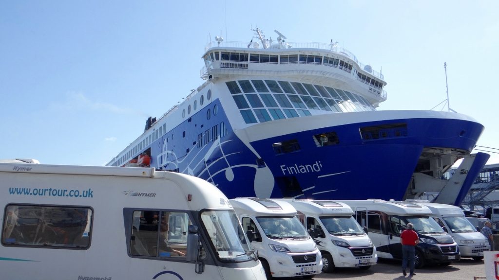 After a quick detour to squeeeeze in a few more drops of diesel at what we think will be lower prices, and an unscheduled trip around the port due to road closures (which weren’t really closed, just sign-posted to say they were), we were parked up with motorhomes of many nationalities as the Finlandia ferry docked. As I popped my sea sickness tablets, the in-cab entertainment was provided by the disembarking and embarking process, before we were called to fill up a gap at the back once no more lorries would fit on board.