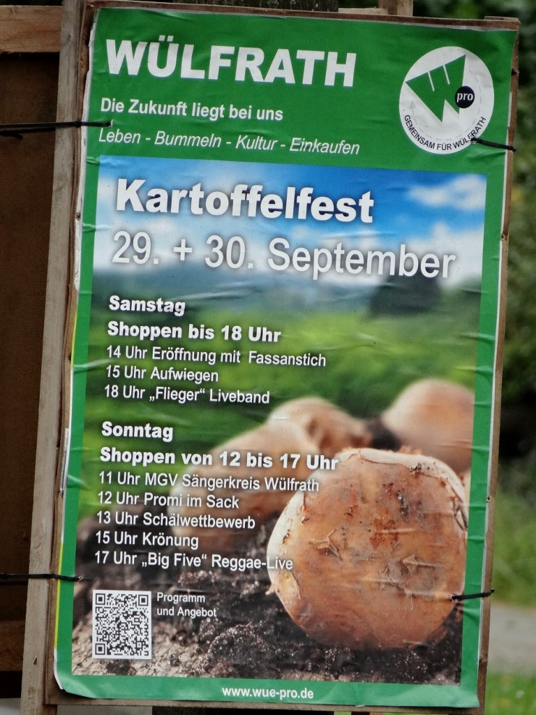 It was a good driving day. A steady stream of rain landed on Dave’s windscreen as we first crossed back into Germany, then over the Rhein river on a bridge with pink and red suspension ropes – I now understand why the use of pink on bridges hasn’t really taken off. We arrived in Wulfrath (chosen because it’s stellplatz is free and within walking distance of the town) and immediately spotted that we’d missed a big event last weekend, the Potatofest! We really do need to do more planning.