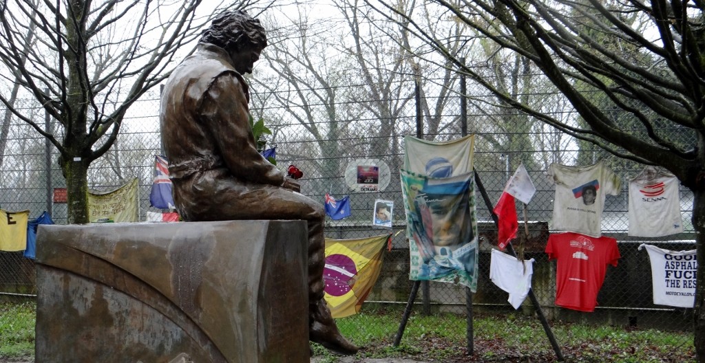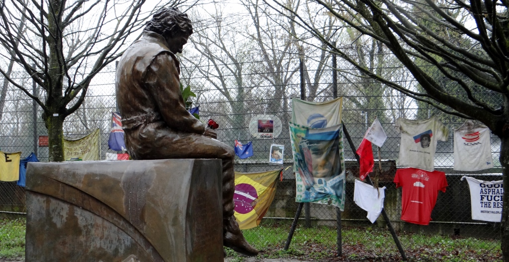 Wandering across the bridge over the river we were surprised by how open the circuit is. There’s a public road or two running through it, and part of the infield is a park with sports facilities. The track itself is behind two layers of fencing, so getting a good view of the cars going around is easy, but to get a photo of them proved tricky. Wandering around we sadly couldn’t find anything to commemorate the life of Ratzenberger at the circuit – there might be something in the museum but we didn’t venture in there. However, it is quite clear where Ayrton’s accident had been. The fencing either side of the track at that point is adorned with flags, messages and trinkets and just a few yards further down is a statue of him.