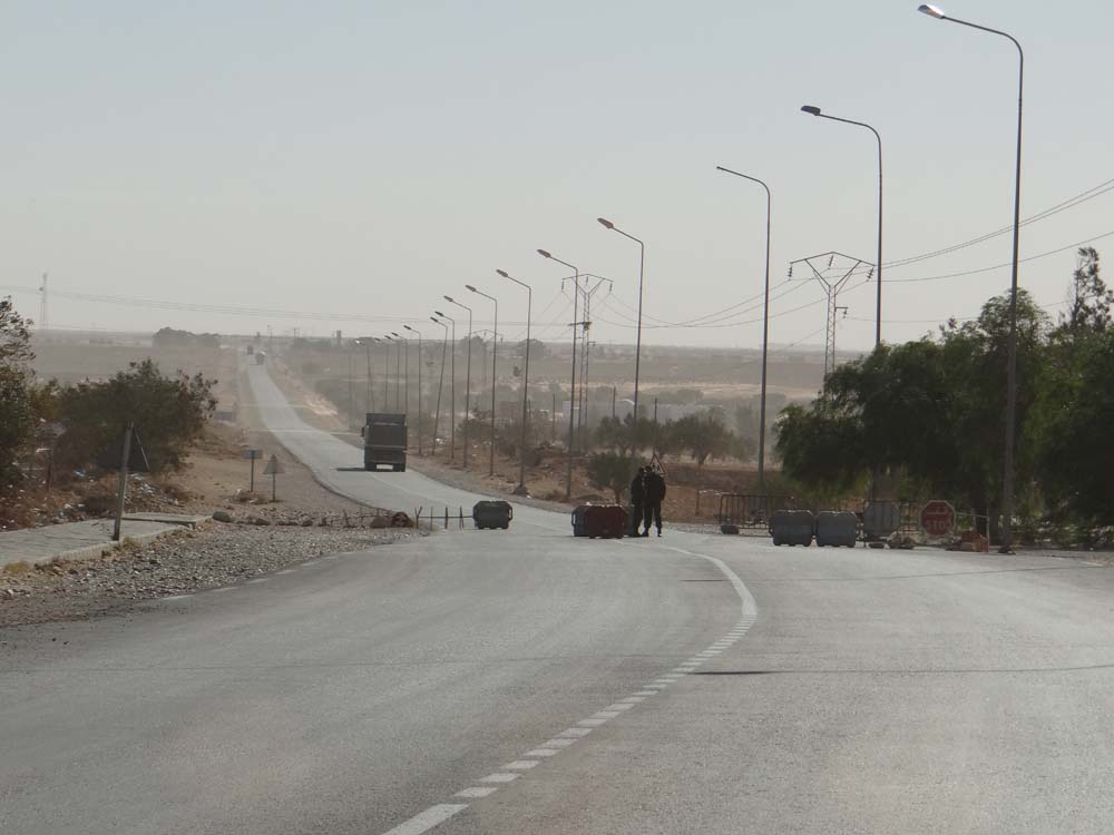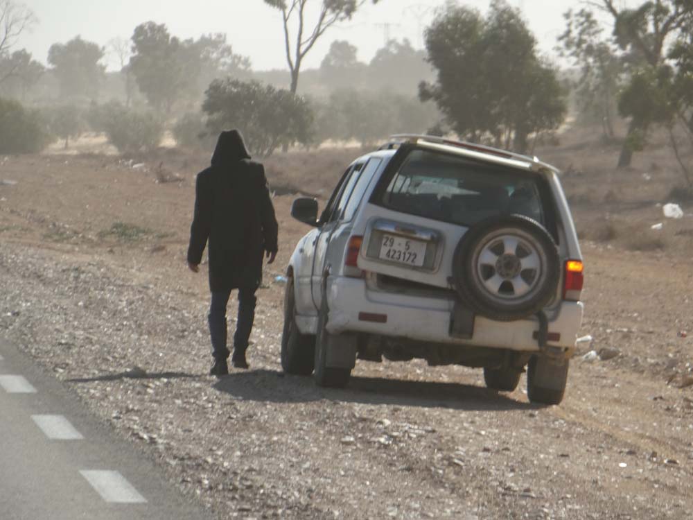 The journey there took us down the main road between these two North African countries, a single carriageway A-road basically, with good tarmac and eyes-wide-crazy drivers. Overtaking like adolescent Italians, four by fours, trucks and louage (minibus) taxis nailed it past around blind corners, dodging between us and whatever truck we were stuck behind. At one point a pair of grinning eyes in the ubiquitous beige pick-up seemed to deliberately swerve into our path, having me wishing I’d invested in some of the adult nappies Ju’s spotted about in abundance. People pointed at us or up the road, asking for a lift, but we were far too nervous to take any passengers.