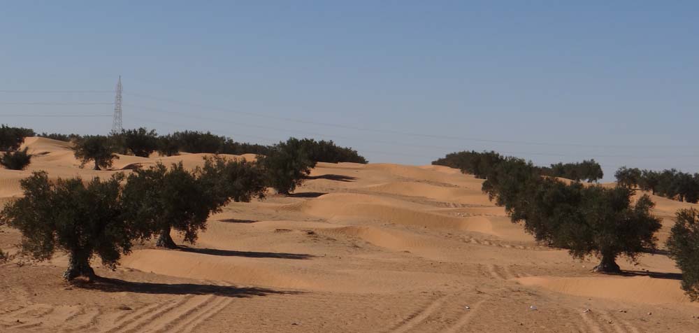 I’d built Ben Guerdane up in my mind to be a lawless border town, a frontier before war-torn Libya which in some sense was no longer fully Tunisian. As we drove along, concentration dialled up the max, more and more impromptu fuel stations filled the sand and dust areas along the road. A few men leapt up to wave thick wads of Libyan currency at us. A four by four passed us which had clearly been crashed, sheared like a pack of cards. A few km later we’d spot it again, the owner’s head under a popped bonnet, pouring water. Revived, it would then over-take us again, at breakneck speed. In between all this the desert drifted back and forth between stony nothing and regimented arrays of olive trees reaching up for air from small dunes drifting around their feet.