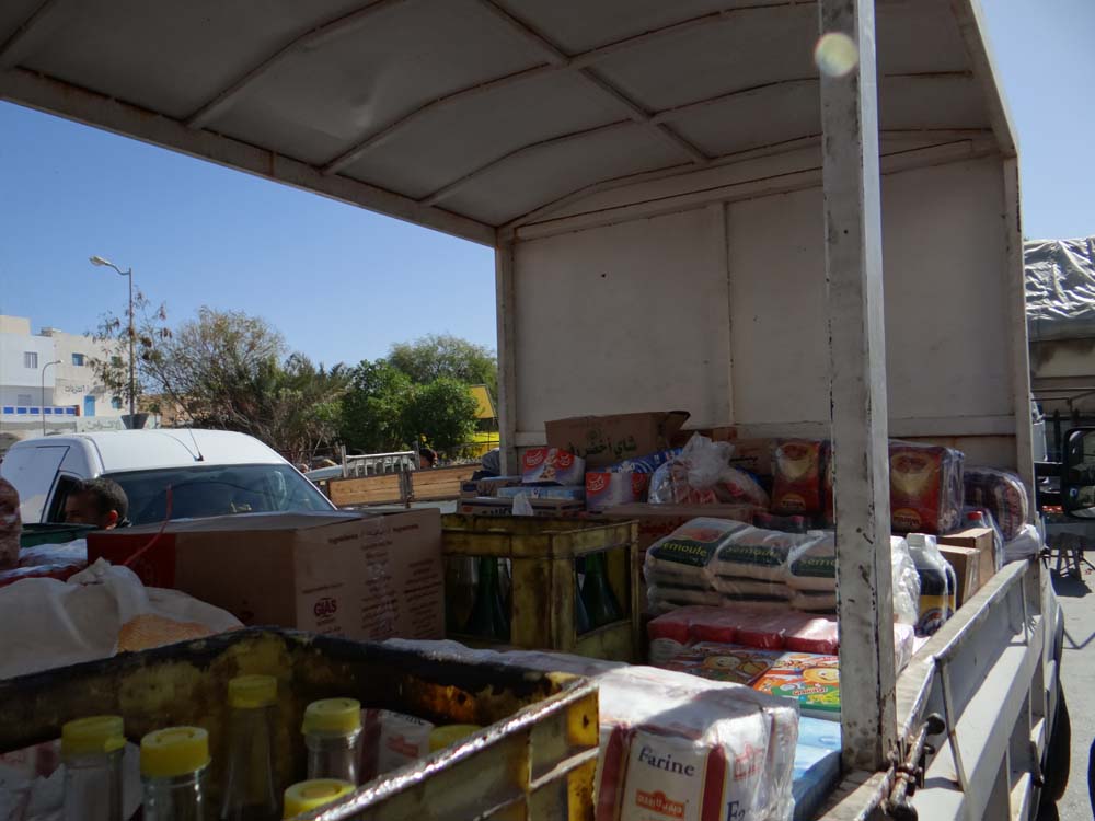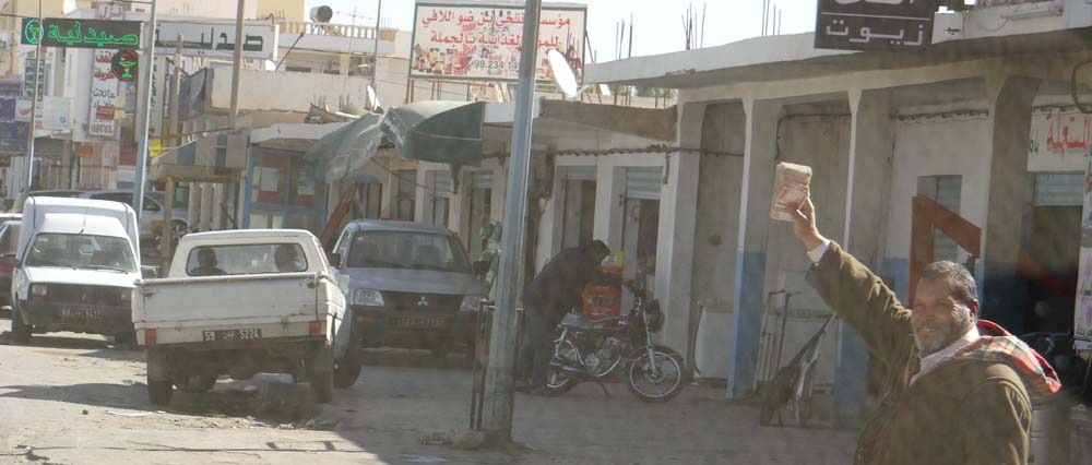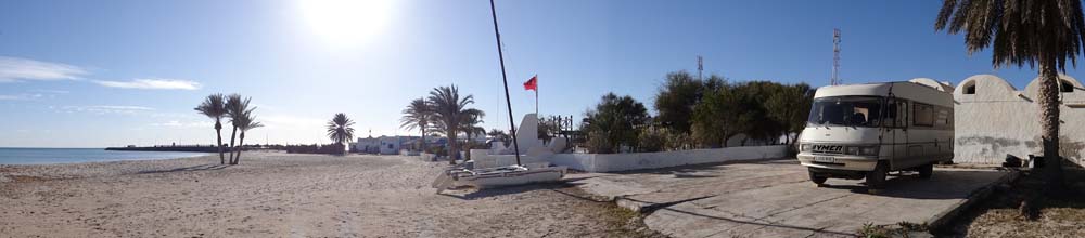 Dave the motorhome has one flippin’ lovely spot overlooking a palm-shaded white sand beach at Centre des Stages et Vacances, Aghir, on the Isle of Jerba, Tunisia (N33.75751 E11.01483). For a while we had the place to ourselves, but are now being entertained by a small storm of nippers legging it around on a treasure hunt. Charlie popped his head out of the door earlier as they all pegged it in our direction, maybe thinking there’s some treasure in here, sending them scattering in fear. It feels great to be here, an oasis of calm and only 16TD a night (about €8). We lost count of the police road blocks we passed today. Maybe seven, none were stopping anyone.